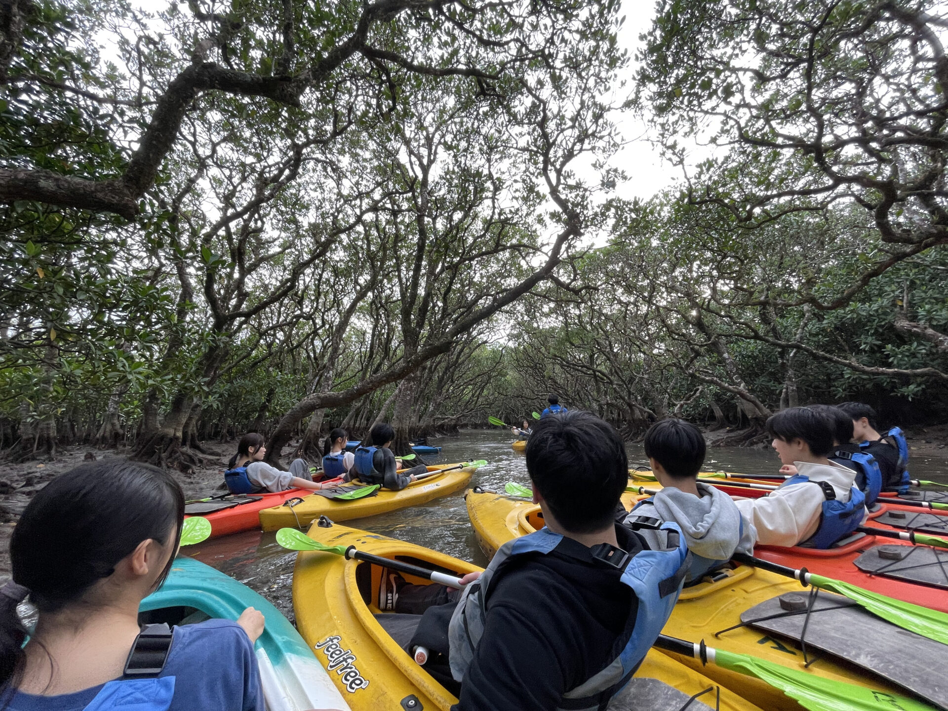 1日目は、マングローブカヌーを体験しました。マングローブは、海水と淡水が混ざり合った場所に生息している植物の総称であり、海水をろ過し純水をだけを吸収することで、海水の中でも枯れずに育つことが出来るそうです。1人乗りと2人乗りがあり、2人乗りは漕ぎながら話したり、協力しながら進むところが楽しかったです。しかし、一見簡単そうに見えるのですが、息を合わせたりする面ではなかなか前に進むでいないチームもあり、中には1人乗りのほうが簡単で、すいすい進むので楽しいと言っていたメンバーもいました。