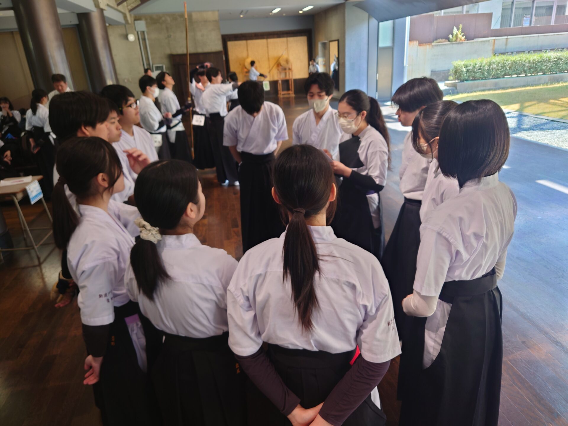 練習試合は3人1チームの団体戦形式で行い、各校から6〜7チームが出場。1人4射を2回、計24射で的中数を競い合いました。道場内には心地よい緊張感が漂い、部員たちは日頃の練習の成果を存分に発揮していました。試合終了後には、各校の顧問の先生方が学校の枠を越えて直接ご指導くださる時間を設けました。他校の先生からのアドバイスは部員たちにとって新鮮な刺激となり、技術向上への意欲をさらに高める貴重な機会となりました。