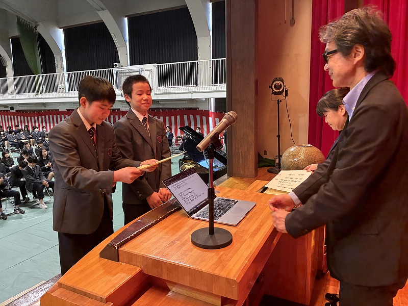 「元旦が一年の始まりなら、4月は年度の始まりです。人が変わる時に、外的な力が必要な時があります。いい機会にしてほしい。昨年度は新渡戸文化に年間80近い外部団体の視察がありました。また、多くの生徒たちの活動で表彰もいただきました。そうして2019年から2025年の改革で、ひと区切りがつきました。新年度はこれまでの4月と違い、第二段階に入ります。Restartの年であり、意識をしてほしい。みんな一人ひとりが変わっていくことで、学校全体が変わっていきます。入学試験もそのうちの1つ。今年度の新入生が入いる入試形態を変えたことで、生徒数が変わりました。新渡戸文化は縦割りの取り組みが多い。コースやプロジェクト・ラボなどで一緒に巻き込んでやっていくことをお願いしたい。たまたまこの年に皆さんと新入生は出会います。いい思い出になる一年になるよう、夢を具体化して進んでほしい。下校の時にやりたいことを考える時間にしてほしい。今後、アースデイの活動などがあります。昨年度以上の成長に期待しています。」